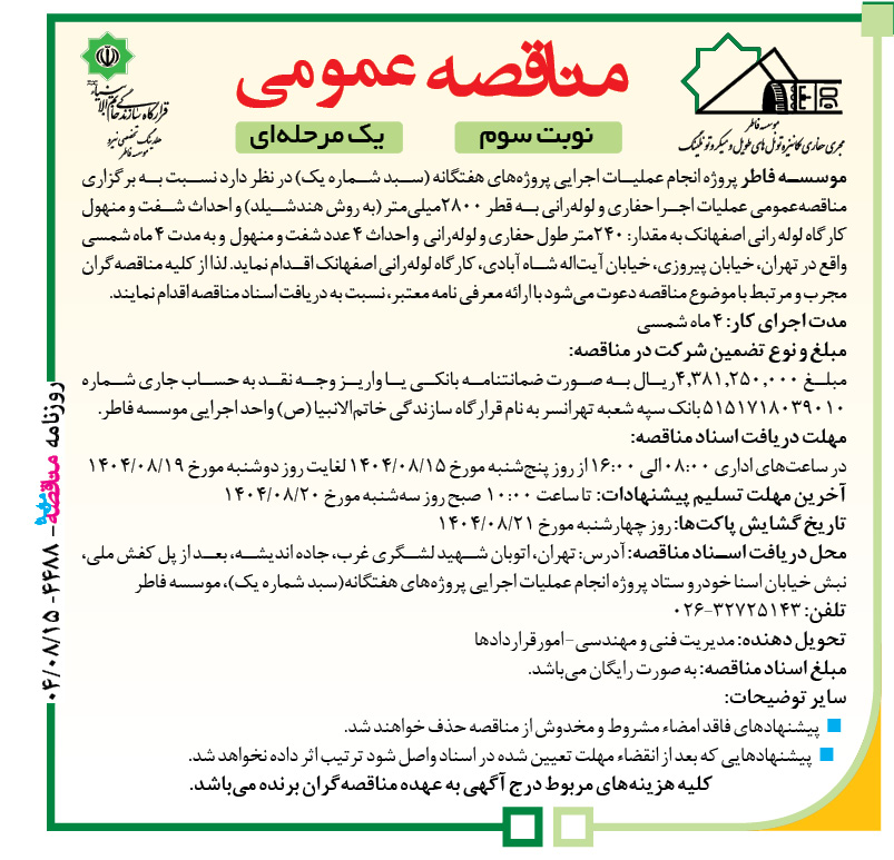 موسسه فاطر پروژه انجام عملیات اجرایی پروژههای هفتگانه (سبد شماره یک) در نظر دارد نسبت به برگزاری مناقصه عمومی عملیات اجرا حفاری و لولهرانی به قطر ۲۸۰۰میلیمتر (به روش هندشیلد) و احداث شفت و منهول کارگاه لوله رانی اصفهانک به مقدار: ۲۴۰متر طول حفاری و لولهرانی و احداث ۴ عدد شفت و منهول و به مدت ۴ ماه شمسی واقع در تهران، خیابان پیروزی، خیابان آیتاله شاه آبادی، کارگاه لولهرانی اصفهانک
