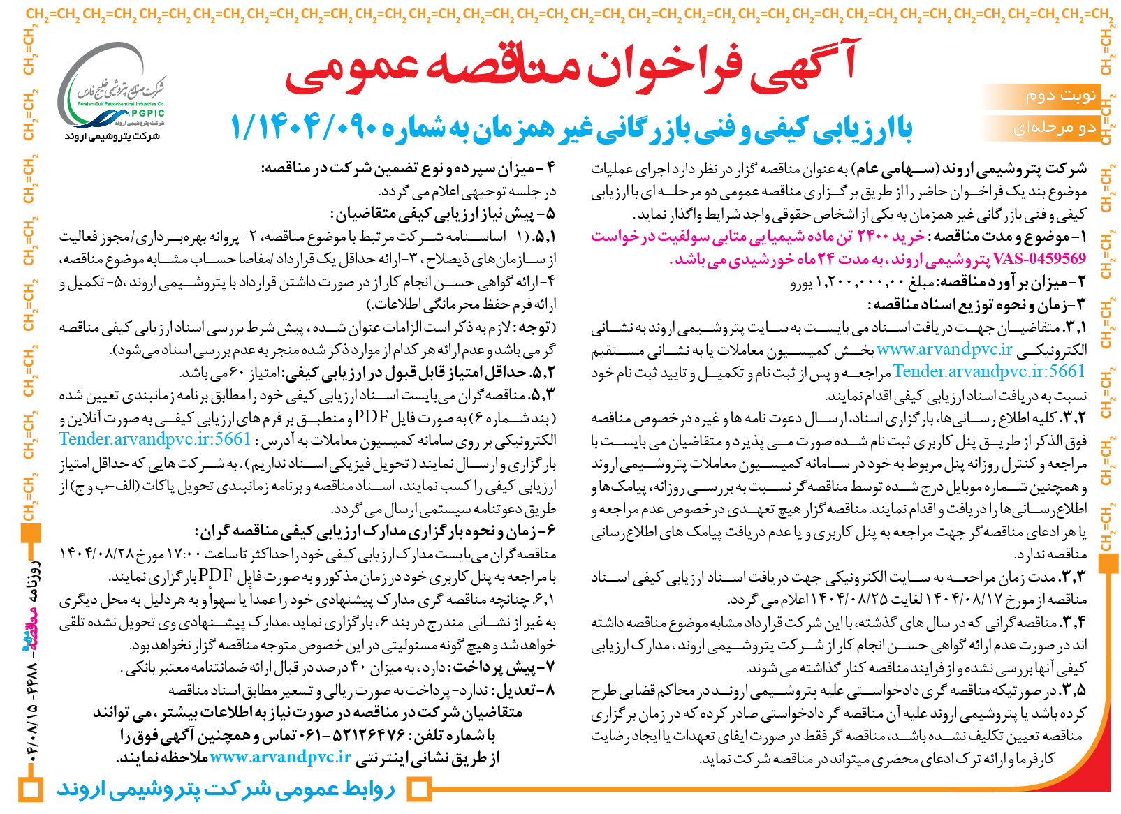 متقاضیان شرکت در مناقصه در صورت نیاز به اطلاعات بیشتر ، می توانند با شماره تلفن : ۵۲۱۲۶۴۷۶ -۰۶۱ تماس و همچنین آگهی فوق را از طریق نشانی اینترنتی www.arvandpvc.irملاحظه نمایند.