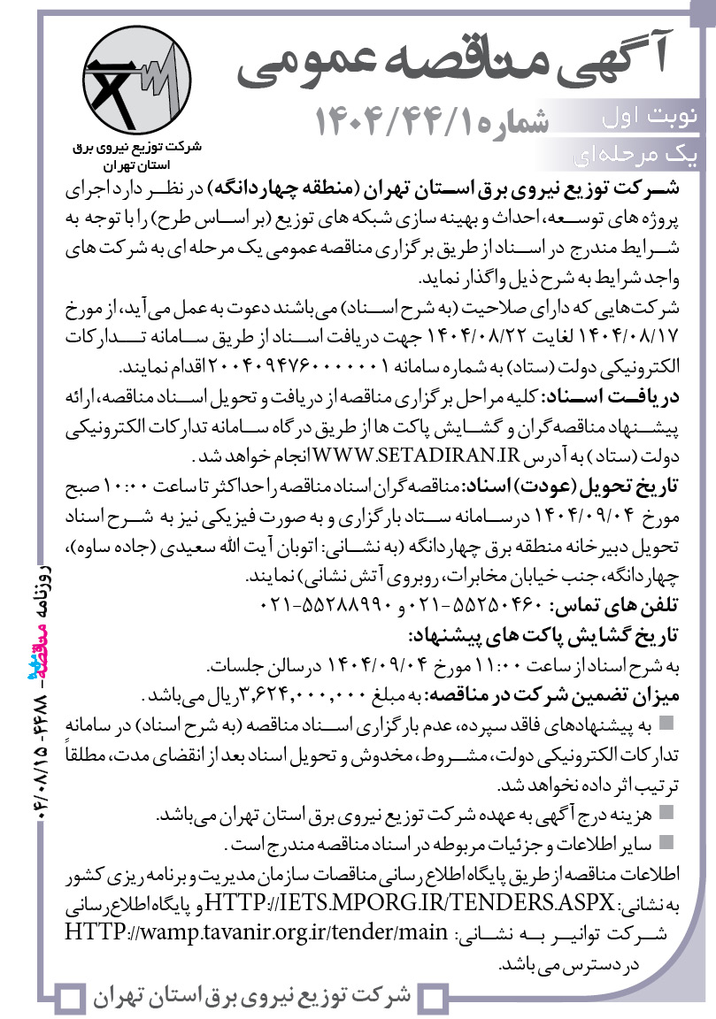 شركت توزيع نيروي برق استان تهران (منطقه چهاردانگه) در نظر دارد اجرای پروژه های توسعه، احداث و بهینه سازی شبکه های توزیع (بر اساس طرح) را با توجه به شرایط مندرج در اسناد از طريق برگزاری مناقصه عمومي یک مرحله اي به شركت های واجد شرايط به شرح ذیل واگذار نمايد.