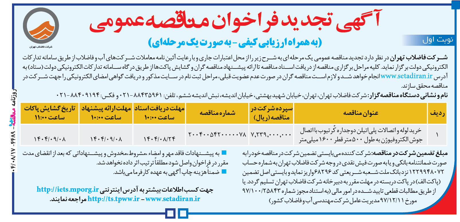 شركت فاضلاب تهران در نظر دارد تجدید مناقصه عمومی یک مرحله ای به شرح زیر را از محل اعتبارات جاری و با رعايت آئین نامه معاملات شرکتهای آب و فاضلاب از طریق سامانه تدارکات الکترونیکی دولت برگزار نماید. کلیه مراحل برگزاری مناقصه از دریافت اسناد مناقصه تا ارائه پیشنهاد مناقصه گران و گشایش پاکتها از طریق درگاه سامانه تدارکات الکترونیکی دولت (ستاد) به آدرس www.setadiran.ir انجام خواهد شد و لازم است مناقصه گران در صورت عدم عضویت قبلی، مراحل ثبت نام در سایت مذکور و دریافت گواهی امضای الکترونیکی را جهت شرکت در مناقصه محقق سازند.