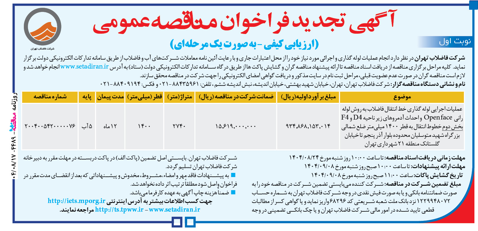 شركت فاضلاب تهران در نظر دارد انجام عملیات لوله گذاری و اجرائی مورد نیاز خود را از محل اعتبارات جاری و با رعايت آئین نامه معاملات شرکتهای آب و فاضلاب از طریق سامانه تدارکات الکترونیکی دولت برگزار نماید. کلیه مراحل برگزاری مناقصه از دریافت اسناد مناقصه تا ارائه پیشنهاد مناقصه گران و گشایش پاکت ها از طریق درگاه سامانه تدارکات الکترونیکی دولت (ستاد) به آدرس www.setadiran.ir انجام خواهد شد و لازم است مناقصه گران در صورت عدم عضویت قبلی، مراحل ثبت نام در سایت مذکور و دریافت گواهی امضای الکترونیکی را جهت شرکت در مناقصه محقق سازند.