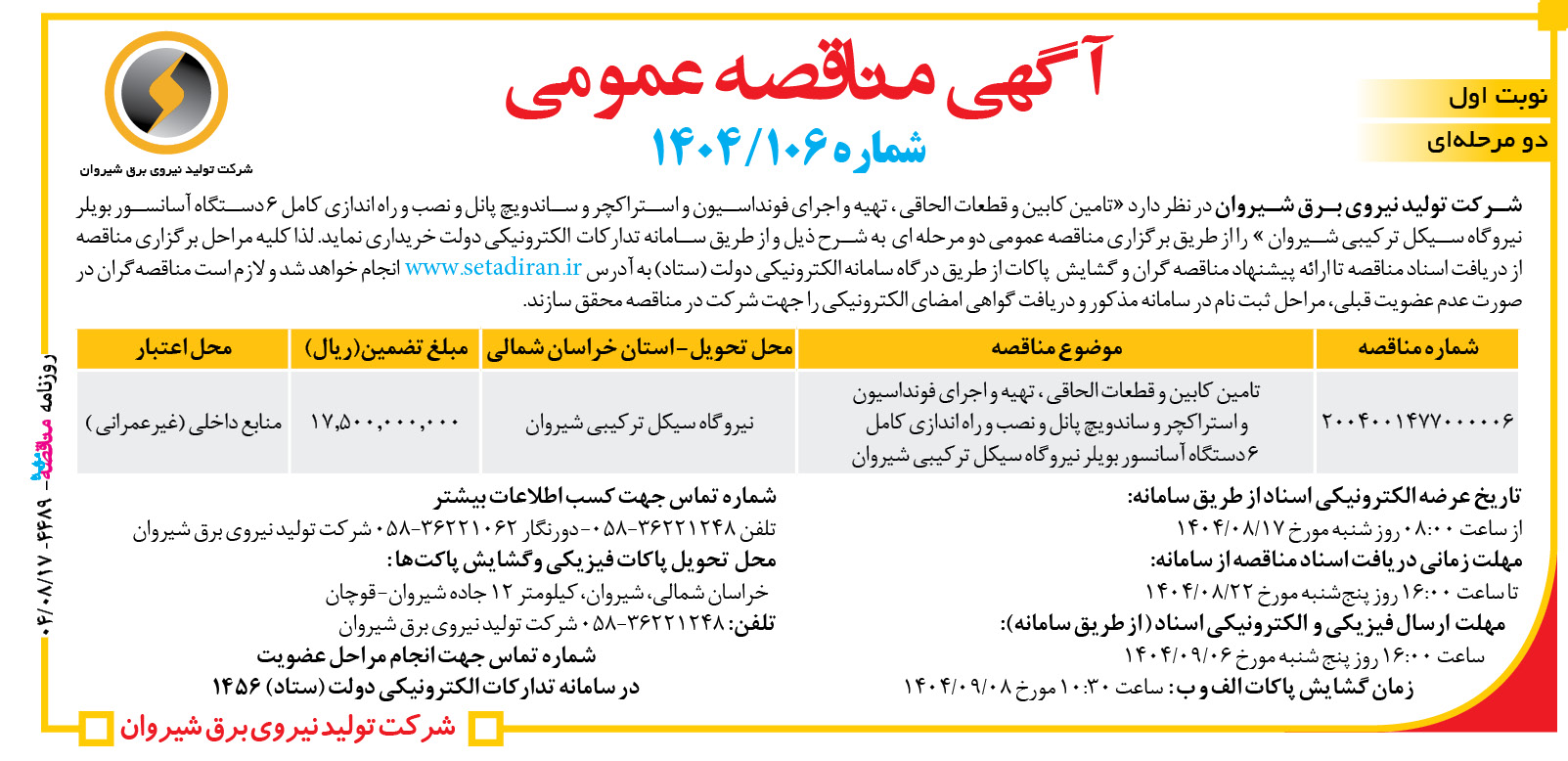 شرکت تولید نیروی برق شیروان در نظر دارد «تامین کابین و قطعات الحاقی ، تهیه و اجرای فونداسیون و استراکچر و ساندویچ پانل و نصب و راه اندازی کامل ۶ دستگاه آسانسور بویلر نیروگاه سیکل ترکیبی شیروان » را از طریق برگزاری مناقصه عمومی دو مرحله ای به شرح ذیل و از طریق سامانه تدارکات الکترونیکی دولت خریداری نماید. لذا کلیه مراحل برگزاری مناقصه از دریافت اسناد مناقصه تا ارائه پیشنهاد مناقصه گران و گشایش پاکات از طریق درگاه سامانه الکترونیکی دولت (ستاد) به آدرس www.setadiran.ir انجام خواهد شد و لازم است مناقصه گران در صورت عدم عضویت قبلی، مراحل ثبت نام در سامانه مذکور و دریافت گواهی امضای الکترونیکی را جهت شرکت در مناقصه محقق سازند.