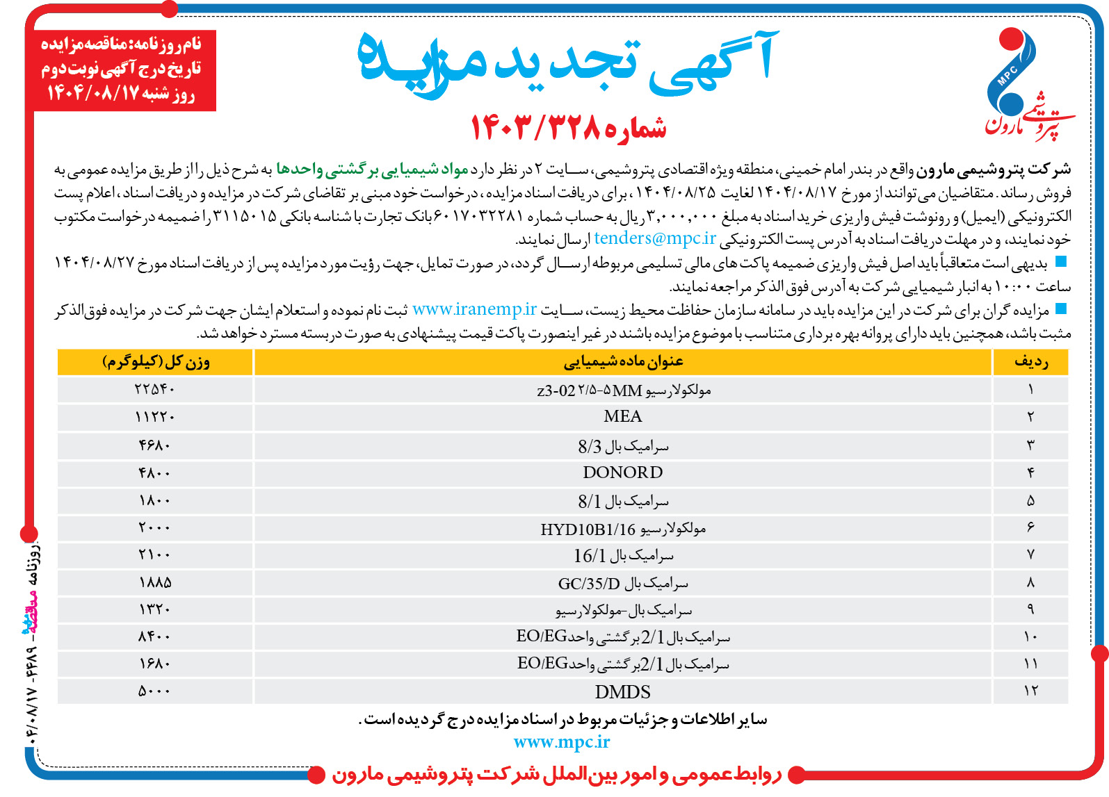 شرکت پتروشيمي مارون واقع در بندر امام خمينی، منطقه ويژه اقتصادي پتروشيمي، سايت ۲ در نظر دارد مواد شيميايي برگشتي واحدها به شرح ذيل را از طريق مزايده عمومي به فروش رساند . متقاضيان ميتوانند از مورخ ۱۷/۰۸/۱۴۰۴ لغايت ۲۵/۰۸/۱۴۰۴ ، براي دريافت اسناد مزايده ، درخواست خود مبني بر تقاضاي شرکت در مزايده و دريافت اسناد ، اعلام پست الکترونيکي (ايميل) و رونوشت فيش واريزي خريد اسناد به مبلغ ۳٫۰۰۰٫۰۰۰ ريال به حساب شماره ۶۰۱۷۰۳۲۲۸۱ بانک تجارت با شناسه بانکي ۳۱۱۵۰۱۵ را ضميمه درخواست مکتوب خود نمايند، و در مهلت دريافت اسناد به آدرس پست الکترونيکي tenders@mpc.ir ارسال نمايند بديهي است متعاقباً بايد اصل فيش واريزي ضميمه پاکت هاي مالي تسليمي مربوطه ارسال گردد، در صورت تمايل، جهت رؤيت مورد مزايده پس از دريافت اسناد مورخ ۲۷/۰۸/۱۴۰۴ ساعت ۱۰:۰۰ به انبار شيميايي شرکت به آدرس فوق الذکر مراجعه نمايند؛