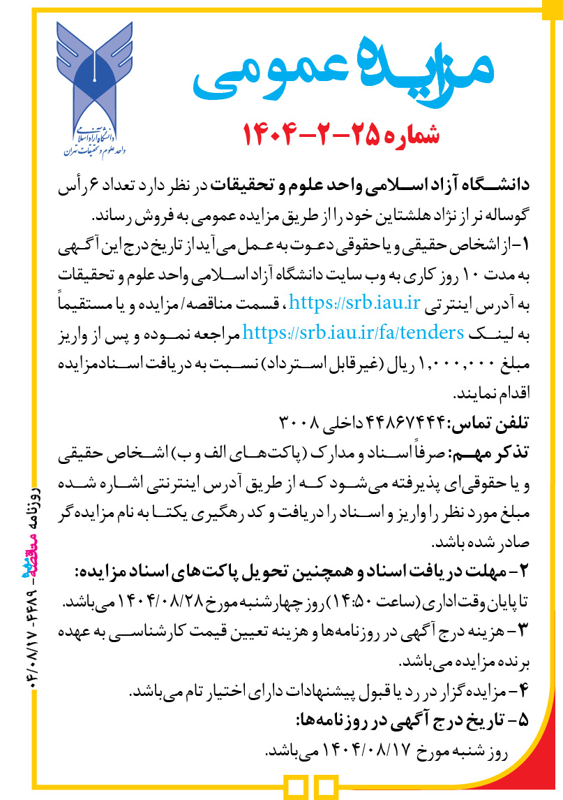 دانشگاه آزاد اسلامی واحد علوم و تحقیقات در نظر دارد تعداد ۶ رأس گوساله نر از نژاد هلشتاین خود را از طریق مزایده عمومی به فروش رساند.