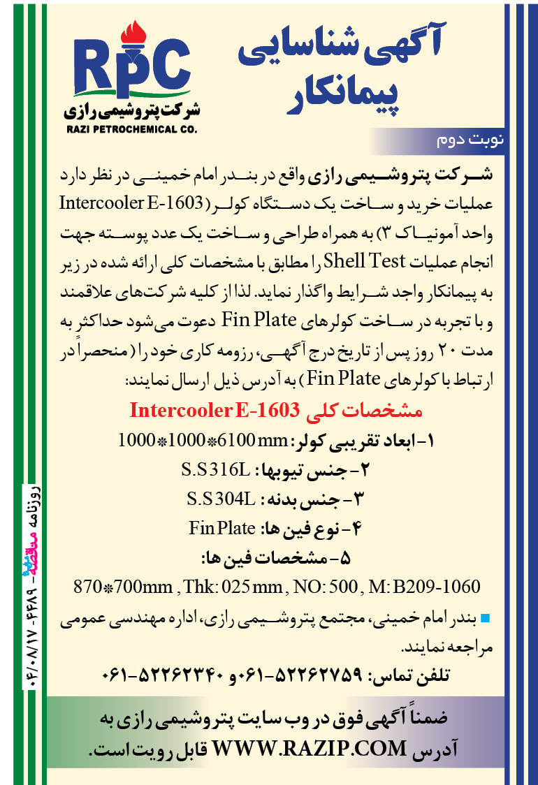 شركت پتروشيمي رازي واقع در بندر امام خميني در نظر دارد عمليات خريد و ساخت یک دستگاه کولر(Intercooler E-1603 واحد آمونياك ۳) به همراه طراحی و ساخت یک عدد پوسته جهت انجام عملیات Shell Test را مطابق با مشخصات كلي ارائه شده در زير به پيمانكار واجد شرايط واگذار نمايد. لذا از كليه شركتهاي علاقمند و با تجربه در ساخت کولرهای Fin Plate دعوت ميشود حداكثر به مدت ۲۰ روز پس از تاريخ درج آگهي، رزومه کاری خود را ( منحصراً در ارتباط با کولرهای Fin Plate ) به آدرس ذيل ارسال نمایند: