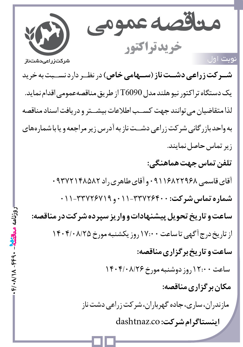 شرکت زراعی دشت ناز (سهامی خاص) در نظر دارد نسبت به خرید یک دستگاه تراکتور نیو هلند مدل T6090 از طریق مناقصهعمومی اقدام نماید. لذا متقاضیان میتوانند جهت کسب اطلاعات بیشتر و دریافت اسناد مناقصه به واحد بازرگانی شرکت زراعی دشت ناز به آدرس زیر مراجعه و یا با شمارههای زیر تماس حاصل نمایند.