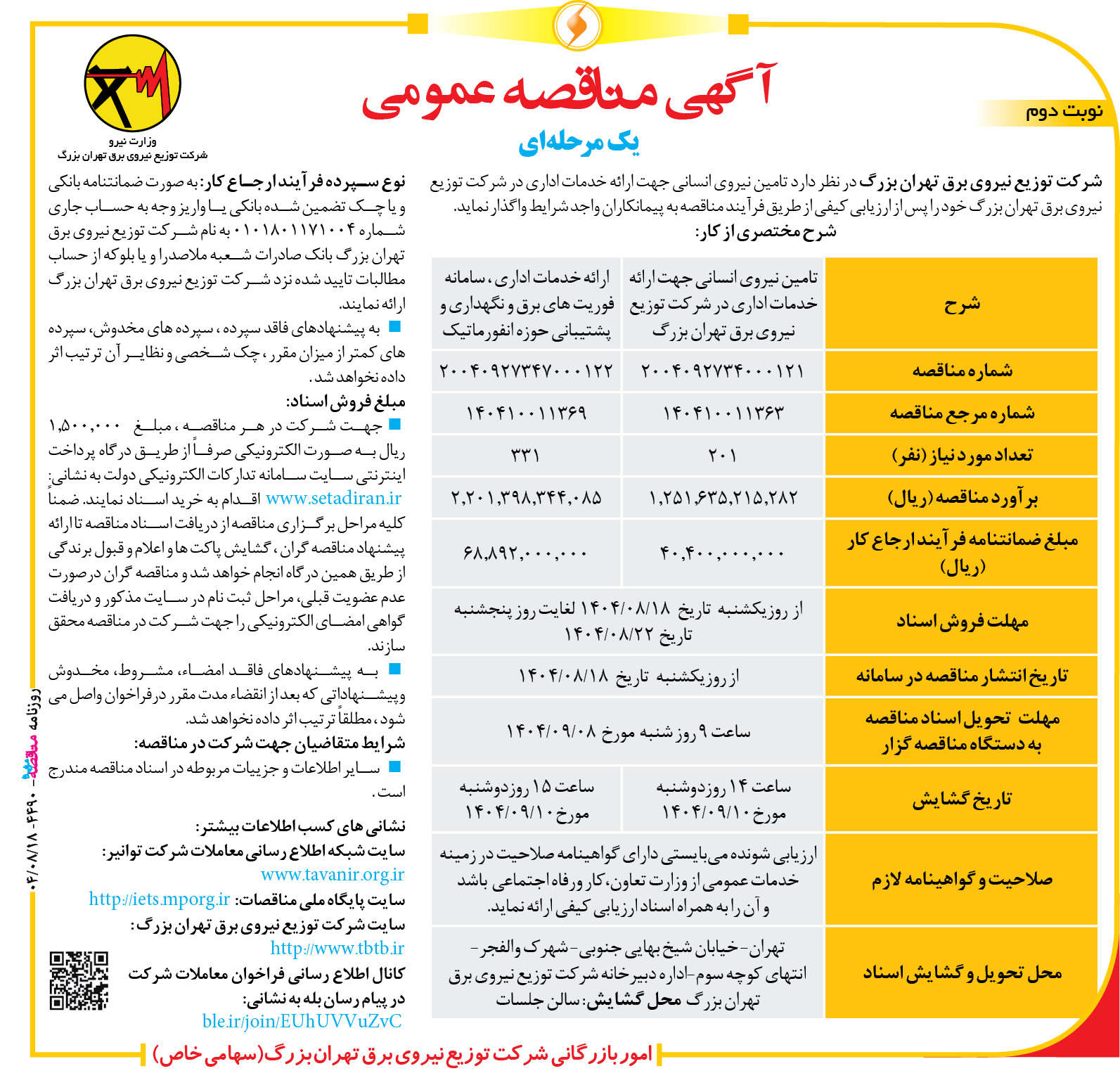 شرکت توزیع نیروی برق تهران بزرگ در نظر دارد تامين نيروي انساني جهت ارائه خدمات اداري در شركت توزيع نیروی برق تهران بزرگ خود را پس از ارزيابي كيفي از طريق فرآيند مناقصه به پیمانکاران واجد شرایط واگذار نماید.