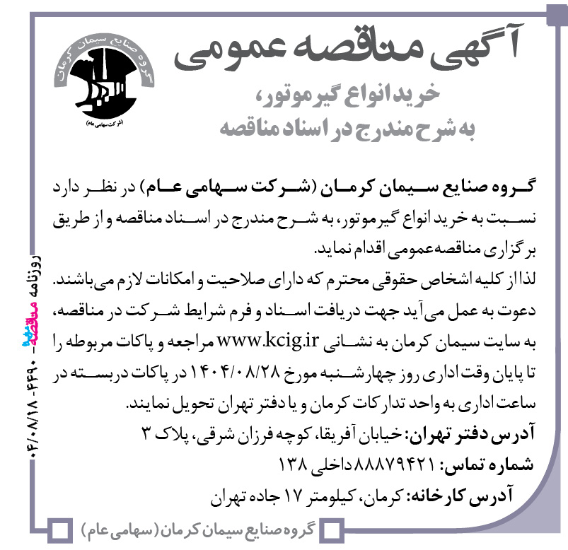 گروه صنایع سیمان کرمان (شرکت سهامی عام) در نظر دارد نسبت به خرید انواع گیرموتور، به شرح مندرج در اسناد مناقصه و از طریق برگزاری مناقصهعمومی اقدام نماید. لذا از کلیه اشخاص حقوقی محترم که دارای صلاحیت و امکانات لازم میباشند. دعوت به عمل میآید جهت دریافت اسناد و فرم شرایط شرکت در مناقصه، به سایت سیمان کرمان به نشانی www.kcig.ir مراجعه و پاکات مربوطه را تا پایان وقت اداری روز چهارشنبه مورخ ۲۸/۰۸/۱۴۰۴ در پاکات دربسته در ساعت اداری به واحد تدارکات کرمان و یا دفتر تهران تحویل نمایند.