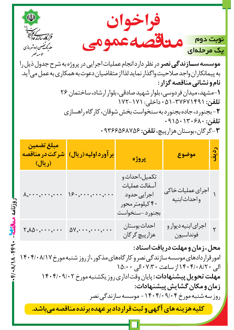 زمان و مکان گشایش پیشنهادات: روز سه شنبه مورخ ۰۴/۰۹/۱۴۰۴ – موسسه سازندگی نصر
