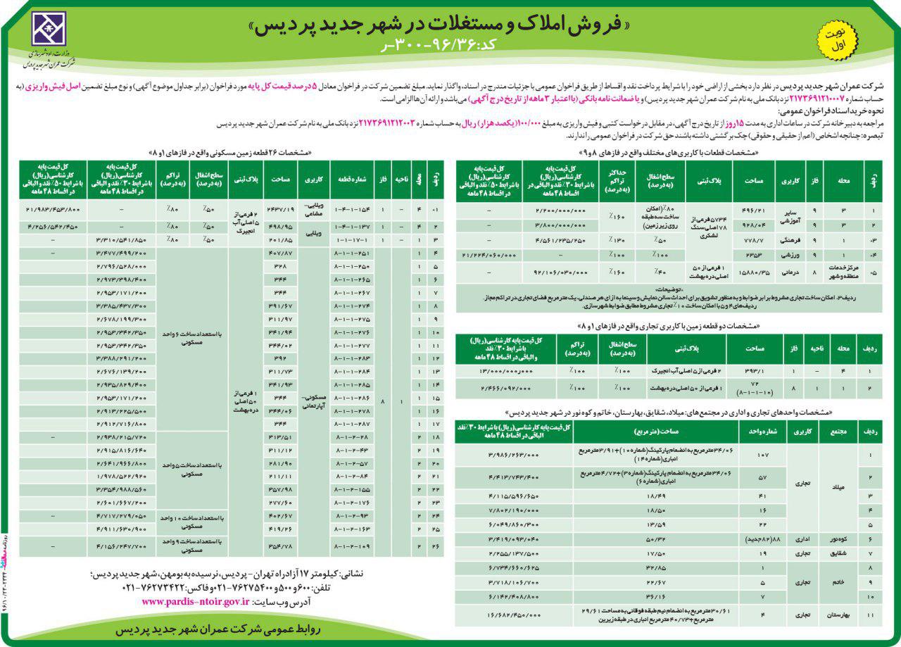 شرکت عمران شهر جدید پردیس در نظر دارد بخشی از اراضی خود را با شرایط پرداخت نقد و اقساط از طریق فراخوان عمومی با جزئیات مندرج در اسناد، واگذار نماید. مبلغ تضمين شركت در فراخوان معادل ۵ درصد قیمت کل پایه مورد فراخوان (برابر جداول موضوع آگهی) و نوع مبلغ تضمین اصل فيش واریزی (به حساب شماره ۲۱۷۳۶۹۱۲۱۰۰۰۷ نزد بانك ملی به نام شركت عمران شهر جدید پردیس) و يا ضمانت نامه بانكي (با اعتبار ۳ ماهه از تاریخ درج آگهی) میباشد و ارائه آنها الزامی است.
