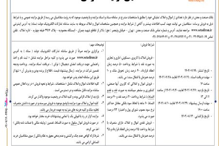 بانک صنعت ومعدن در نظر دارد تعدادي از اموال و املاك تمليكي خود را مطابق با مشخصات مندرج در سامانه ستاد و اسناد مزايده و با وضعيت موجود كه به رؤيت متقاضيان مي رسد از طريق مزايده عمومي و با شرايط ذيل به فروش برساند : متقاضيان مي توانند جهت كسب اطلاعات بيشتر […]