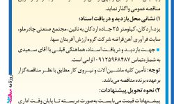 آگهی مناقصه(نوبت دوم) شرکت سیمان دورود در نظر دارد، حمل، بارگیری و جابجایی مواد اولیه(داخل شرکت) را از طریق مناقصه به پیمانکار واجد شرایط واگذار نماید. متقاضیان میتوانند جهت آگاهی از شرایط و دریافت اسناد مناقصه حداکثر ظرف مدت۱۰ روز از تاریخ انتشار آگهی به محل شرکت مراجعه و یا از پایگاه اینترنتی بازدید و […]