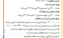 آگهی فراخوان شرکت فولاد و نورد سبا اصفهان ۰۱-۱۴۰۴ رديف شماره آگهی موضوع مهلت ارسالمدارک ۱ ۶۹۱۰۲۷۰۴ عملیات تعمیر، سرویس و آماده سازی رولیکها و قطعات واحد تعمیرگاه ریخته گری شرکت فولاد و نورد صبا (در کارگاه پیمانکار) ۲۳/۰۵/۱۴۰۴ ۲ ۶۹۱۰۴۷۰۰ ۷۰۳-۷۰۲-۷۰۲ طراحی و مهندسی، نصب ، خرید تجهیزات، تست و راه اندازی و تضمین […]